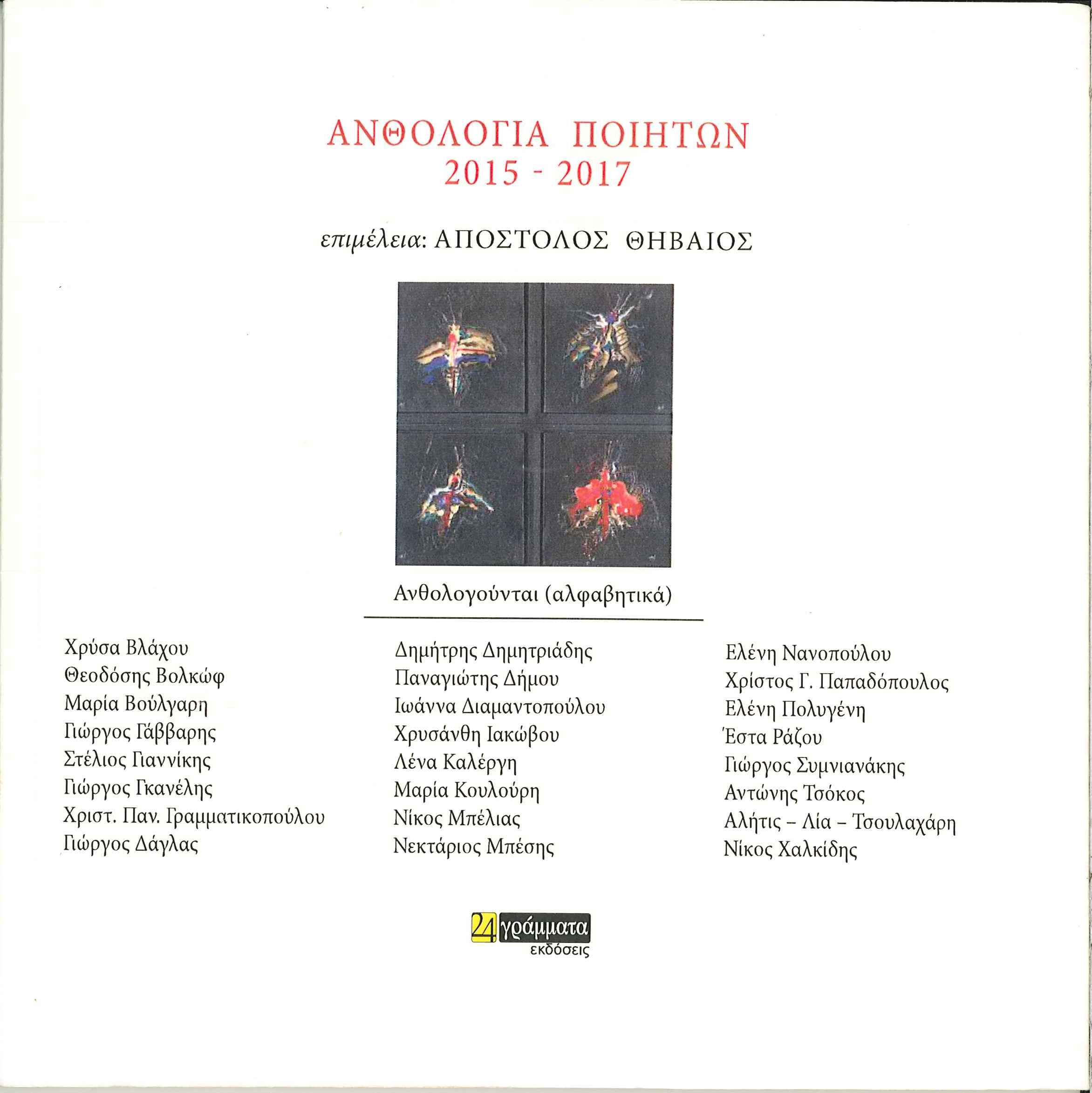 Το 2018 κυκλοφόρησε η "Ανθολογία ποιητών 2015-2017" από τις Εκδόσεις 24 γράμματα σε επιμέλεια Απόστολου Θηβαίου, στην συμμετείχαν 24 ποιητές.