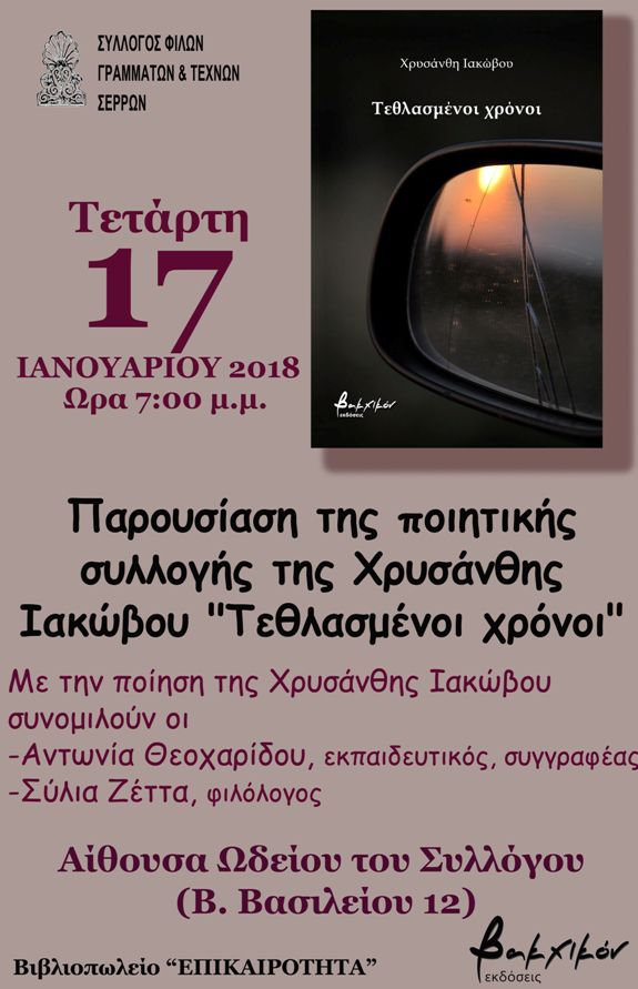 Η παρουσίαση της ποιητικής συλλογής "Τεθλασμένοι χρόνοι" έγινε στις 17 Ιανουαρίου 2018, στην αίθουσα του Συλλόγου Φίλων Γραμμάτων και Τεχνών Σερρών. Για το βιβλίο μίλησαν η εκπαιδευτικός-συγγραφέας Αντωνία Θεοχαρίδου και η φιλόλογος Σύλια Ζέττα. Η παρουσίαση οργανώθηκε απο τις Εκδόσεις Βακχικόν, το Σύλλογο Φίλων Γραμμάτων και Τεχνών Σερρών και το Βιβλιοπωλείο Επικαιρότητα.