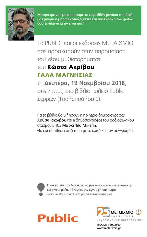 Η παρουσίαση του βιβλίου "Γάλα Μαγνησίας"(Εκδόσεις Μεταίχμιο, 2018) του Κώστα Ακρίβου έγινε στις 19 Νοεμβρίου 2018, στο βιβλιοπωλείο Public Σερρών.