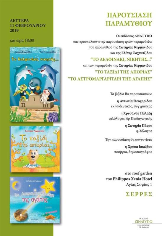 Η παρουσίαση των παραμυθιών "Το αστρομαργαριτάρι της αγάπης", "Το δελφινάκι, νικητής…" και "Το ταξίδι της απορίας" (Εκδόσεις Ανάτυπο) της Σωτηρίας Κυρμανίδου έγινε στις 11 Φεβρουαρίου στο ξενοδοχείο PHILIPPOS XENIA στις Σέρρες. Για τα βιβλία μίλησαν οι Χρυσάνθη Παλάζη, Αντωνία Θεοχαρίδου, Σωτηρία Πάνου και τον συντονισμό της εκδήλωσης ανέλαβε η Χρυσάνθη Ιακώβου.