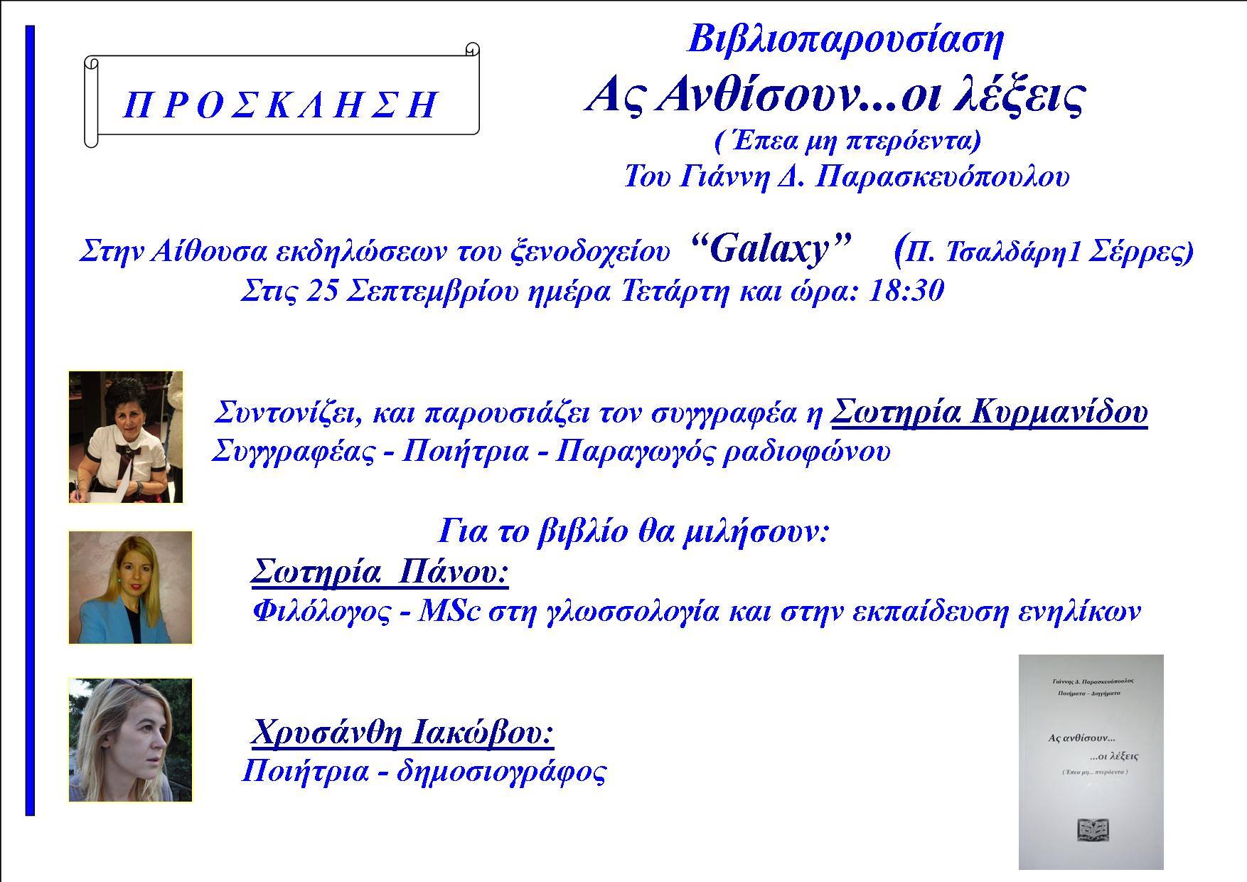 Συμμετοχή στην παρουσίαση του βιβλίου "Ας ανθίσουν οι λέξεις" του Γιάννη Παρασκευόπουλου