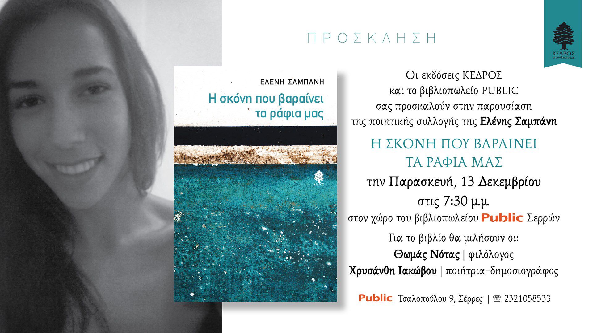 Στις 13 Δεκεμβρίου 2019 παρουσιάστηκε στα Public η πρώτη ποιητική συλλογή της Ελένης Σαμπάνη "Η σκόνη που βαραίνει τα ράφια μας" (Εκδόσεις Κέδρος 2018). Για το βιβλίο μίλησαν ο Θωμάς Νότας, φιλόλογος, και η ποιήτρια-δημοσιογράφος Χρυσάνθη Ιακώβου.