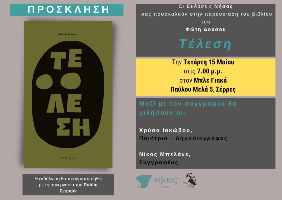 Την Τετάρτη 15 Μαΐου παρουσιάσαμε το μυθιστόρημα του Φώτη Δούσου "Τέλεση" (Εκδόσεις Νήσος), στο καφέ-μπαρ Μπλε Γιακάς. Για το βιβλίο μιλήσαμε εγώ και ο συγγραφέας Νίκος Μπελάνε.