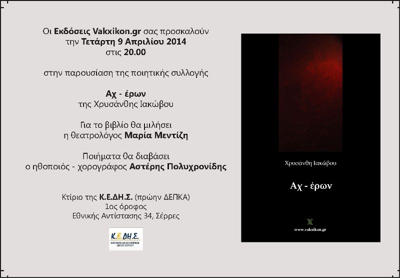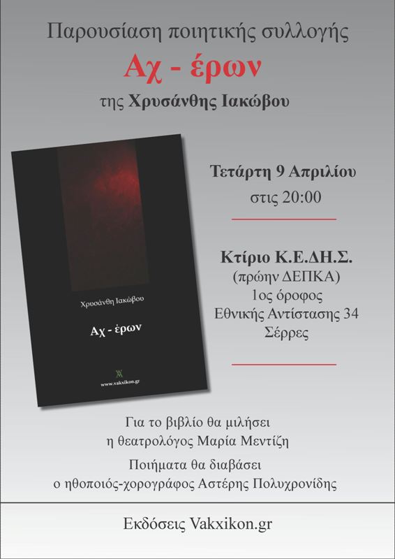 Η παρουσίαση του βιβλίου "Αχ-έρων" (Εκδόσεις Vakxikon.gr, 2013) στις Σέρρες έγινε την Τετάρτη 9 Απριλίου 2014 στην αίθουσα εκδηλώσεων της ΚΕΔΗΣ. Για το βιβλίο μίλησε η θεατρολόγος Μαρία Μεντίζη και αποσπάσματα διάβασε ο ηθοποιός-χορογράφος Αστέρης Πολυχρονίδης.