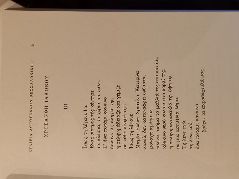 ‘Θα σκίσεις τους ουρανούς/τα σύννεφα θα στάζουν τη θλίψη σου/ω πραγματικότητα/της ομορφιάς θάνατε/κρύφτηκε/η ομορφιά σου κρύφτηκε/στον ματωμένο ήλιο του πρωινού/στις βαμμένες κουρτίνες του απογεύματος/στο αποτύπωμα των χειλιών σου/στο ποτήρι του καφέ/η ομορφιά του κόσμου κρύφτηκε/χάθηκε/διαλύθηκε/τότε/που έσκιζες τους ουρανούς/που έστυβες τα σύννεφα/Και τότε κάποιος ψιθύρισε:/Lacrimosa’, φέρνοντας στο νου εικόνες του καλοκαιριού που ήρθαν, έφυγαν, μα θα ξανάρθουν!